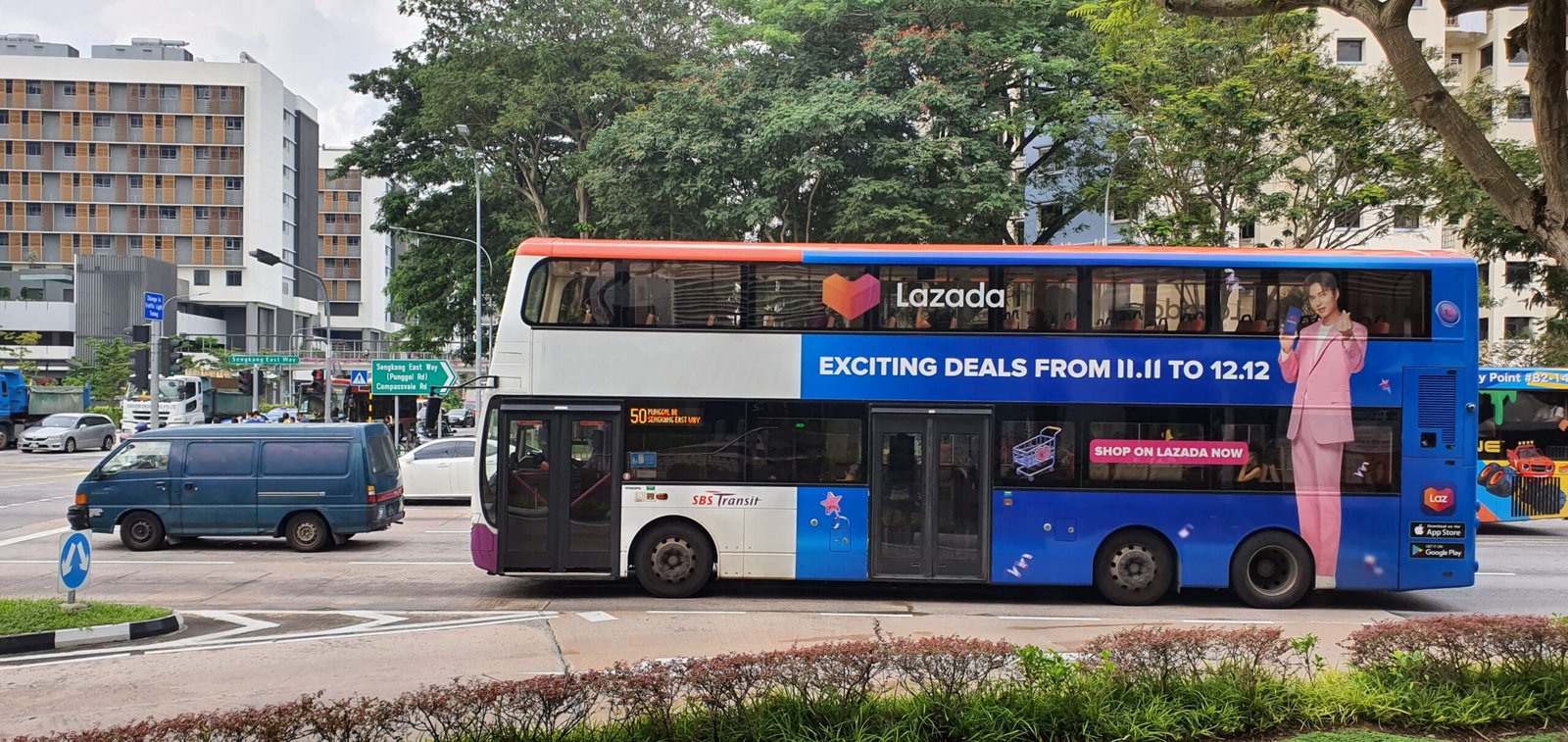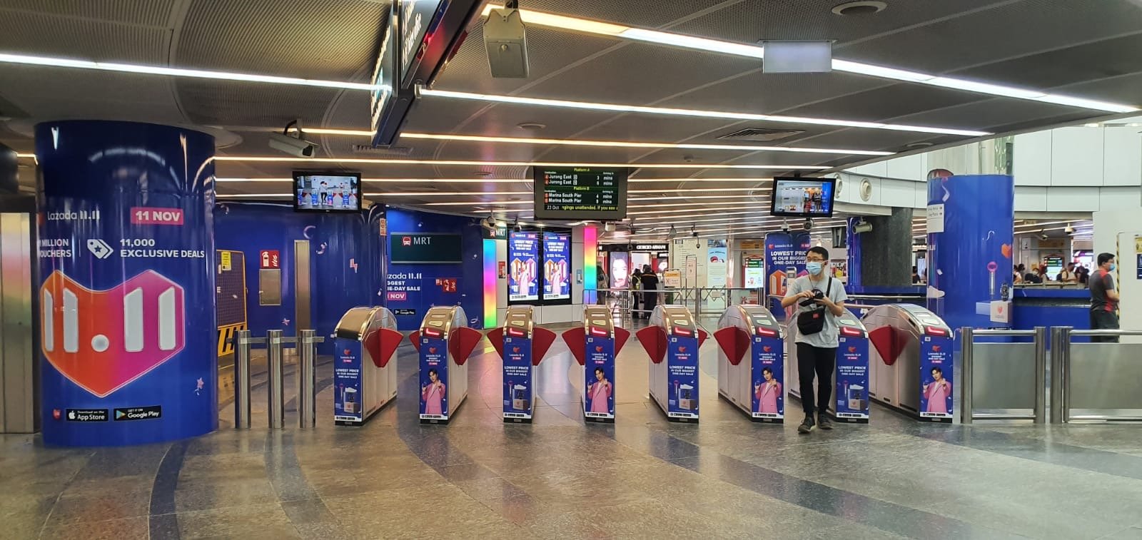 From train station pillar wraps, platform floors, station doors, in-train panels and screens at key MRT interchanges including Dhoby Ghaut, HarbourFront, Serangoon, and beyond, to OOH digital screens, bus and taxi advertisements, Lazada’s presence was impossible to miss. Each execution was designed to command attention, communicate fast, and stay unmistakably on brand even in high-traffic, fast-moving environments.